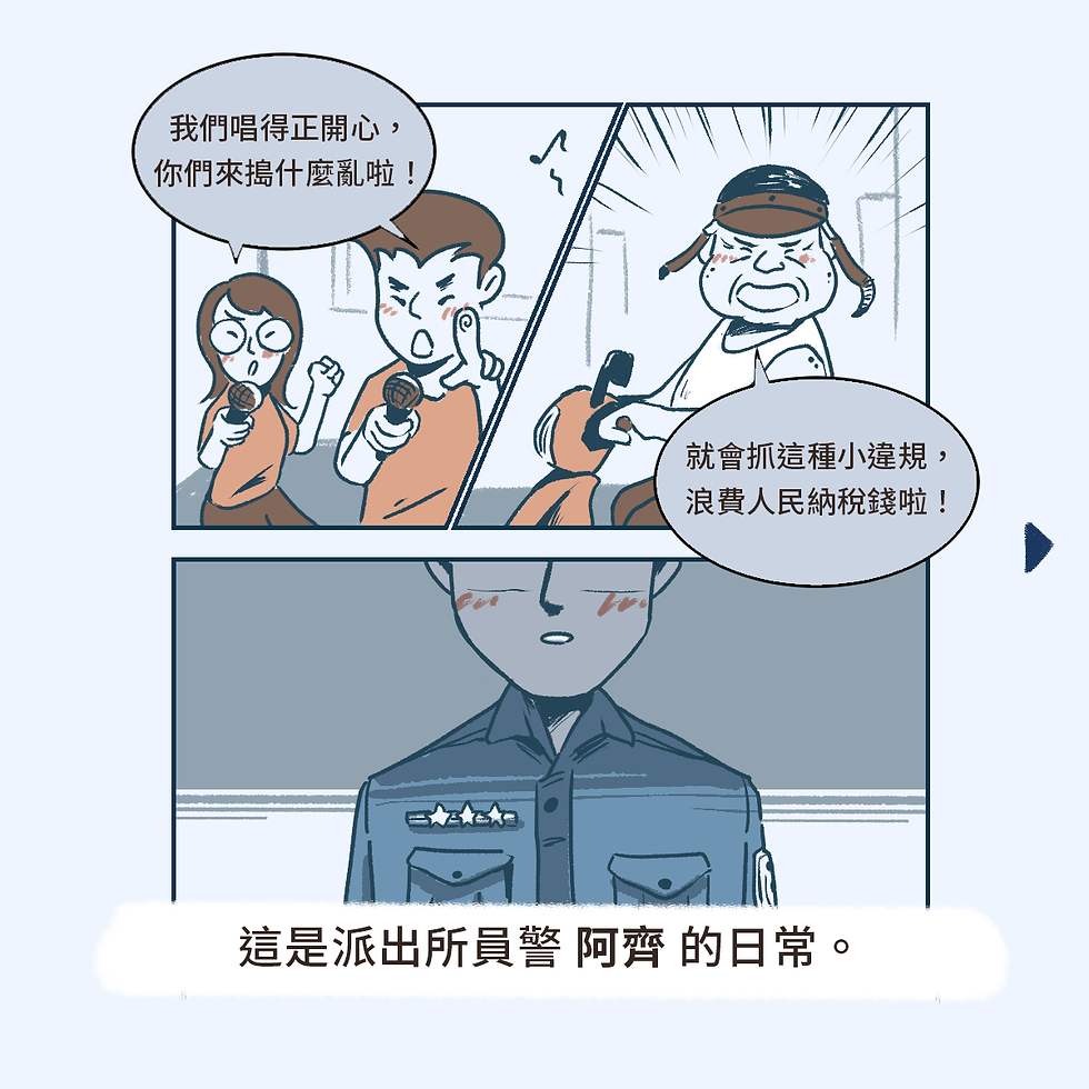 「可以請你們先稍微安靜方便我們值勤嗎?」阿齊盡可能客氣地對民眾說,但包廂內似乎沒有人聽到阿齊的好言相勸,有人繼續唱歌,有人故意點歌向阿齊咆哮。無奈下,阿齊只好稍微大聲地請民眾停止動作。